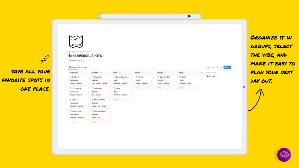 iNNEVERSE.SPOTS template for notion. Our gift to help you go out and do stuff with your community!