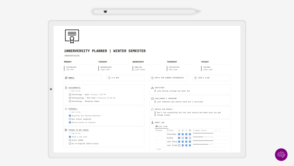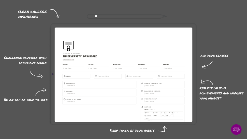 iNNERVERSE 🧠Dashboard for college. You can download the app on your phone/tablet or use it on your browser. After downloading the file, click on the "..." and duplicate it to your notion profile.